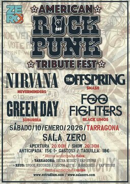 “American Rock Punk” regresa en su nueva temporada con el festival de tributos más rompedor, que ya ha petado las mejores salas de todo el país reviviendo los temazos de las grandes bandas del punk-rock americano, de la mano de sus mejores bandas tributo: NIRVANA (Neverminders), GREEN DAY (Suburbia), THE OFFSPRING (Smash) Y FOO FIGHTERS (Black Limos).
